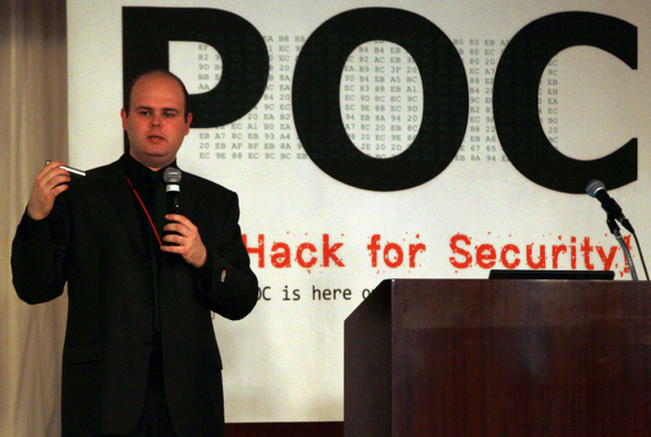 지난 11월4일 서울에서 열린 국제 해킹·보안 콘퍼런스인 ‘2011 POC’에서 이스라엘의 화이트해커 야니브 미론이 원자력·수력 등 발전설비, 군사시설, 교통체계 등을 통제하는 SCADA 시스템을 무력화시키는 해킹 기술에 대해 설명하고 있다. <한겨레21> 정용일 기자