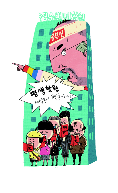 공부신 전쟁! 모든 세계적 기업들이 그랬듯이 전쟁 덕분이었죠. 그 전쟁은 7년 전 ‘학원 교육 양성화 법안’이 가결·공포되자 공식화됐습니다. 여기 젊은 친구들은 잘 모르겠지만, 한때 학교가 교육의 중심이던 때가 있었는데 그 시대가 종료된 거죠. 학교 교육이 유명무실화됐으니 아예 공교육을 최소화하자, 능력 있는 학원에 교육을 넘기자, 이런 것이었죠. MC 법안의 주요 내용이 이랬습니다. 초·중등 의무교육은 문맹퇴치 수준으로 최소화, 학교에서는 최대 6교시까지의 정규 수업만 허용, 방과 후 수업은 일절 금지, EBS 등 무료 교육 행위와 대학생 과외 등 비인가 교육 행위를 엄금. 제가 고등학교 2학년 때였는데요. 사탐 과목에 꼭 나온다고 달달 외웠죠. 공부신 법안 자체가 학원 재벌들의 로비로 이루어졌기 때문에, 곧바로 후속 조처들이 나왔어요. 지금은 흔히 볼 수 있는 멀티플렉스 학원이 속속 등장했고요. 처음에 30층짜리 건물 전체를 학원으로 쓴다고 했을 때는 다들 미쳤다고 했죠. 하지만 5개 층을 운동장 트랙으로 만들어 체육 수업을 진행했고, 정규 과목 외에 태권도·영어·피아노 학원들까지 한 건물 안에 집어넣었어요. 애들이 이 학원, 저 학원 옮기며 샐 걱정도 없고, 급식까지 챙겨주니 공부하기엔 최적의 조건이었죠. 당일 수업 미션 통과자에 한해 건물 내에 있는 PC방과 노래방을 사용할 수 있게 했고요. 수업 불참자나 불량학생들은 학원 경비대가 철저히 단속했죠. MC 그때 초등학교 다니던 여동생이 오전 수업만 마치고 셔틀버스 타고 학원에 갔다가 밤 9시에 집에 돌아오더라고요. 그러면서 하는 말이 “오 마이 갓. 여긴 버스 드라이버부터 구내 문구점 알바까지 전부 영어로 말해”. 공부신 취업난 때문에 해외 유학생 출신들도 일자리를 구하기 어렵잖아요. 그래서 파트타임으로 일하면 바로 그 건물에서 취업 학원 과정을 이수할 수 있게 했더니 너나 할 것 없이 지원을 했습니다. 폭탄주 제조, 비자금 관리도 학원에서 배워라 MC ‘학원 교육 양성화 법안’을 처음 만들 때는 영세 사업자들을 위한 일자리 창출의 목적도 있었습니다. 하지만 PC방이나 만화대여점처럼 잠깐 붐을 이루다가 사라졌어요. 학원가의 부익부 빈익빈 현상이 커져 만점벅스, 열공리아, 책도날드 3대 메이저 학원 체인이 전국을 휩쓸었습니다. 그러자 전교조를 중심으로 공교육을 정상화해야 한다는 반발이 생겨났어요. 교육부에서도 학원들의 영향력을 축소시키려고 여러 조처를 취하기도 했고요. 공부신 소 잃고 외양간 불 지르고, 도랑 엎고 가재 방목한 셈이죠. 이미 학원 대기업에는 미국 중심의 다국적 자본이 몰려들어와 있었고, 그들에겐 한-미 자유무역협정(FTA)이 있었습니다. 4년 전 일부 학교에서 학원 선행학습, 그러니까 학원에서 배울 걸 미리 학교에서 가르치려다 적발된 사건이 있었습니다. 이걸 교육부에서 덮어버리려 했는데, ‘투자자-국가 소송제’(ISD) 제소로 천문학적 액수를 배상할 위기에 처하자 바로 깨갱 했죠. MC 바로 그 시점에 공부신 선생님의 점수버네가 후발주자로 뛰어듭니다. 공룡 학원들과의 전쟁, 만만치 않았을 텐데요. 공부신 제가 이리저리 스카우트되며 3대 메이저 학원에 강사로 있어봤습니다. 그런데 점점 이게 한계에 이르렀다는 생각이 들더라고요. 그래서 내 방식의 학원을 해봐야겠다 싶어서 수십억원대 연봉을 박차고 나왔습니다. 제가 20여 년 학원 강사를 하며 요식업을 병행했는데, 그런 생각이 들더군요. 공부는 누가 하나? 학생들만. 그럼 밥은 누가 먹나? 3살부터 100살까지. 제 책상 앞에 적었습니다. ‘평생 학원! 3살부터 100살까지.’ 어릴 때부터 학원 강사가 골라주고 찍어주는 방식으로 공부해온 아이들. 그래서 일류대 가면 자기가 알아서 공부할 것 같습니까? 천만에요. 또 그렇게 대학 나오면 철썩 취업되고 바로 밥벌이 됩니까? 아니죠. 각종 자격증에 영어회화에 챙길 것 많습니다. 회사에서 승진하고, 사회생활에서 인정받고… 이런 것도 자기 머리로 못해요. 하나하나 찍어서 외우라고 하지 않으면 아무것도 못해요. 그렇게 자랐으니까요. MC 다른 메이저 학원들이 대형 빌딩에 매달릴 때 점수버네는 동네의 작은 점포들을 공략했어요. 브랜드도 다양하게 만들었죠. 대학생들을 위한 ‘학점버네’, 졸업 뒤의 ‘취업버네’, 주부들을 위한 ‘요리버네’ 등이 있고요. ‘실버버네’는 노년층을 위한 건강 관리, 사기 방지, 며느리 다스리기 등으로 인기를 모았습니다. 그리고 역시 핵심은 ‘골드버네’였죠. 공부신 처음부터 메인 타깃이었습니다. 동네 학원 프랜차이즈 사업을 위해서도 그룹을 대표할 만한 주력 얼굴이 필요했습니다. 골드버네는 성인 직장인과 사업자를 대상으로 사회생활을 위한 모든 노하우를 가르치고 있습니다. 영어나 프레젠테이션은 기본이고요. ‘접대 골프 져주기’ ‘폭탄주 제조 31종’ ‘상사에게 사랑받는 장기자랑’ ‘비자금 관리와 꼬리 자르기’ 등의 세부 강좌들이 있죠. 과거에는 명문대학교 출신의 학연이 이 사회를 지배했지만, 이제 메이저 학원이 더 강력한 커넥션으로 등장하고 있습니다. 실제 지난 3년간 국내 5대 기업 