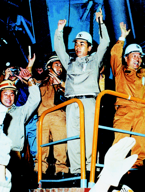 우리나라 최초로 포항제철 제1고로에서 쇳물이 터져나온 1973년 6월9일, 박태준 당시 포철 회장은 임직원과 함께 만세를 불렀다. 포스코 제공
