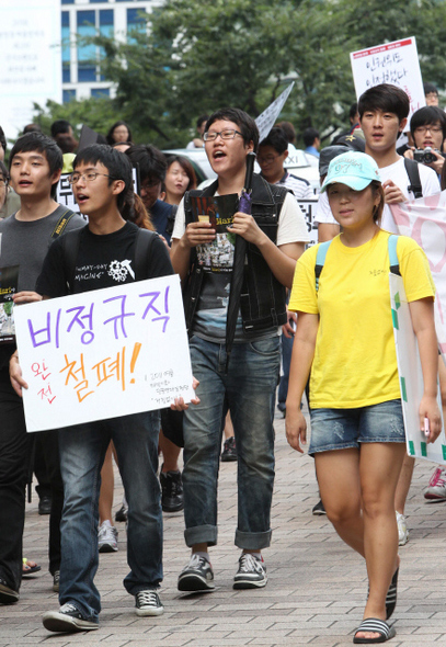 2011년 한국의 사회운동은 ‘외부세력’이란 뜨거운 상징 안에 고스란히 응축돼 있다. 지난 8월9일 서울 명동에서 용역깡패 폭력증언 기자회견을 마친 뒤 거리를 행진하는 시민들. <한겨레> 김태형 기자