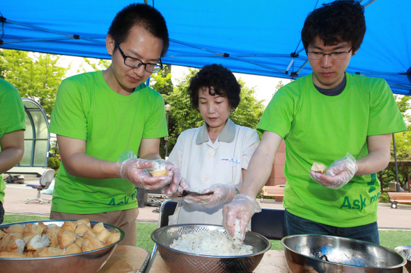 5월18일 서울 서강대 교정에서 청소노동자들과 함께 유부초밥을 만들고 있는 대학생들. <한겨레> 김태형 기자