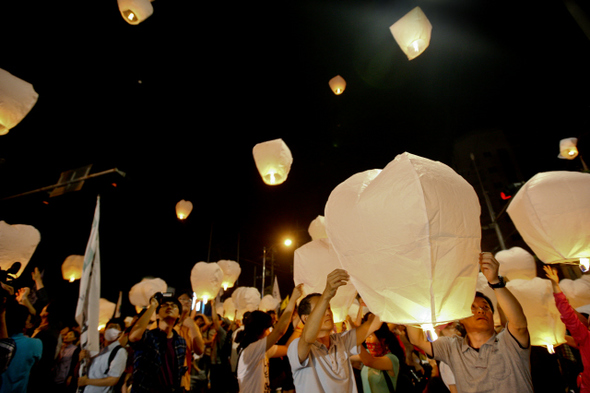 7월30일 부산 한진중공업 앞에서 정리해고 철회를 요구하며 풍등을 날리는 희망버스 참가자들. <한겨레21> 박승화 기자