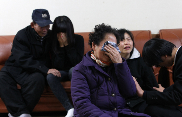 작업도중 열차에 치여 숨진 코레일공항철도 협력업체 코레일테크 노동자들의 빈소가 차려진 인천시 서구 신세계장례식장에서 12월9일 유족들이 오열하고 있다. <한겨레> 이정우 기자