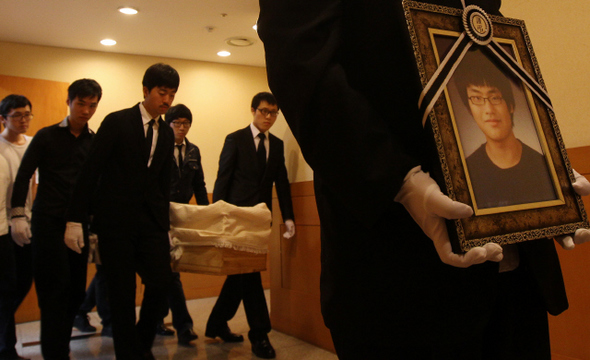 경기 고양시 이마트 탄현점 기계실에서 냉동설비 수리 작업 중 질식해 숨진 고 황승원씨의 발인식이 사고 45일 만인 8월15일 고양시 동국대학교 일산병원 장례식장에서 열렸다. <한겨레> 이정아 기자