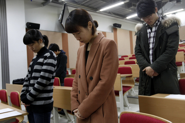2월24일 한국예술종합학교 영상원 학생들이 고 최고은 작가를 추모하는 묵념을 하고 있다. <한겨레> 김명진 기자