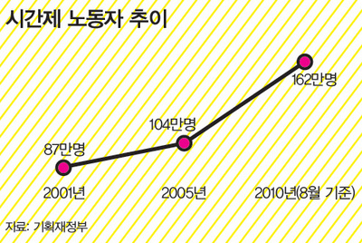 시간제 노동자가 최근 10년 사이 두 배로 늘었다. 그 와중에 정부가 2011년 가정과 일의 병행 및 신규 일자리 창출을 명분으로 도입한 공공기관 단시간 근로제가 비정규직을 더 양산하고 있는 것으로 나타났다. 신규 채용 인원의 10% 이상을 단시간 노동자로 뽑도록 하는 게 핵심인데, 정부는 이 제도를 내년에 전체 공공기관으로 확대할 계획이다.
