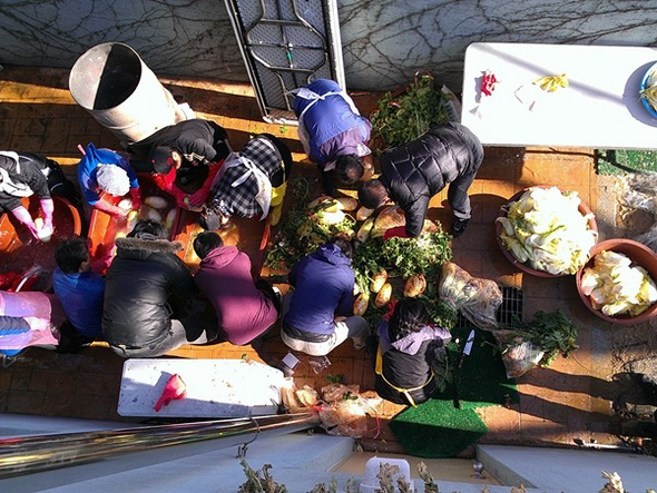 2011년 12월17일 천주교 수원대리구청에서 ‘희망김장’ 1천 포기를 담그는 사람들. 배추뽑기·마늘까기부터 시작한 과정은 힘들었으나, 장기투쟁 노동자들의 겨울 먹거리를 마련했다는 생각에 고생의 끝은 달았다. 희망김장 기획단 ㅔㅈ공