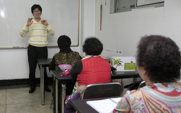 2011년 12월28일 구식 난로 때문에 공기는 탁하고 온기는 부족한 교실에서, 최창우 대표가 어머니들을 상대로 한글 강의를 하고 있다.