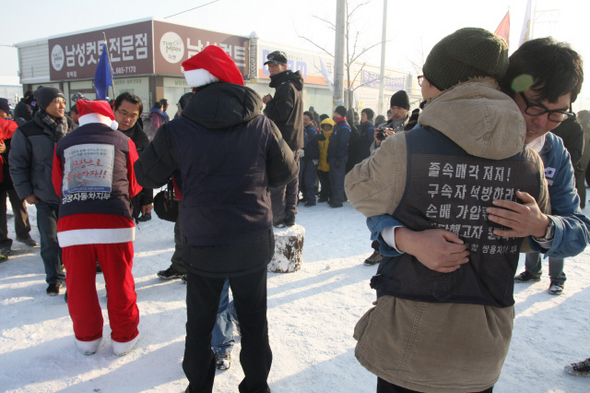 1차 희망텐트촌 다음날인 지난해 12월24일, 참석자들이 행사를 마친 뒤 아쉬워하며 포옹을 나누고 있다. 2012년을 가늠할 문제로 떠오른 쌍용자동차 해고노동자 복직 열기는 1월13~14일 희망텐트로 이어졌다. 이창근 제공