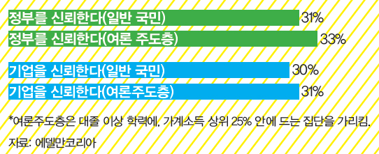 우리나라 국민 10명 가운데 7명은 “기업을 불신한다”고 답했다. 홍보업체 ‘에델만코리아’가 우리나라 18살 이상 일반 국민 1천 명을 대상으로 설문을 벌여보니, “기업을 신뢰한다”고 답한 응답자는 30%로 나타났다. 아시아·태평양 지역에서 같은 답을 준 평균 비율 51%보다 크게 낮았다. <중앙일보>는 지난 2월8일 ‘재벌개혁론, 오만과 편견의 합작품’이라는 제목으로 “표 위해 대기업 때리는 정치권은 편견”이라고 보도했다. 이 말을 듣는 국민이 정작 <중앙일보>를 때릴지, 정치권을 때릴지 의문이다.