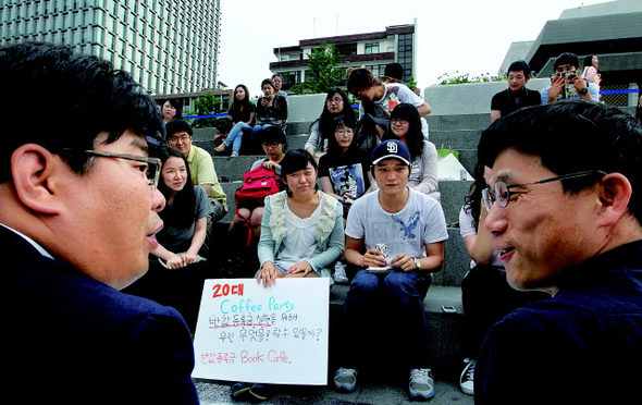 2011년 6월9일 저녁 서울 광화문 해치광장 계단에서 열린 ‘반값 등록금 실현을 위한 커피파티’에서 토론에 참여한 정재승 카이스트 교수(왼쪽)와 문화평론가 진중권씨가 이야기를 나누고 있다. <한겨레> 이정우