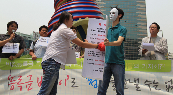 2011년 6월, 서울 청계광장에서 청년유니온이 ‘반값 등록금 시행을 촉구하는 등록금 빚쟁이 기자회견’을 열고 등록금에 저당 잡힌 청춘을 묘사하는 퍼포먼스를 벌이고 있다. <한겨레> 신소영