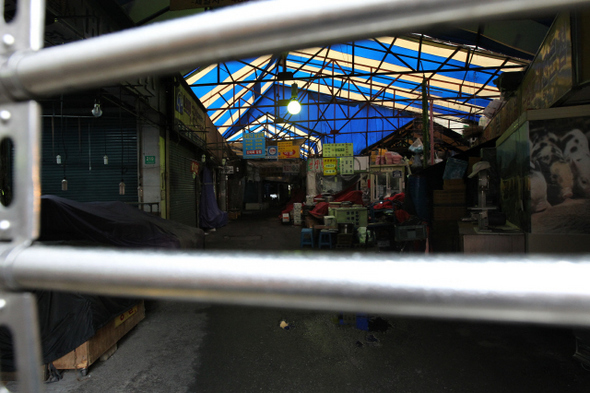 대형마트와 SSM이 문을 닫은 4월22일, 서울 강동구 천호신시장의 출입문이 닫혀 있다. 천호신시장은 40년 전부터 매주 둘째·넷쨋주 일요일을 정기휴무일로 정하고 쉬어왔다.