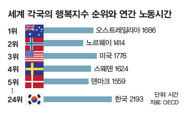 피로는 간 때문이야~? 한국인의 만성피로는 일~ 때문이다. 경제협력개발기구(OECD)가 최근 발표한 세계 36개국 행복지수(The Better Life Index)를 보면, 한국은 OECD 가입국 가운데 노동시간이 가장 긴 나라다. 연간 2193시간이다. 타의 추종을 불허한다. 노동시간이 긴 나라들은 행복지수가 낮았는데, 한국의 행복지수도 24위에 머물렀다. 반면 노동시간이 가장 짧은 나라인 네덜란드(연간 1377시간)는 행복지수 7위였다. 일하는 시간을 줄여, 일자리를 나누자는 이야기가 그냥 나오는 게 아니다. 그런데 노동시간 축소를 추진하겠다던 고용노동부가 딴소리를 하고 있다. 주당 연장근로 한도 12시간에 휴일근로를 포함시키는 내용의 근로기준법 개정을 추진했으나 재계 의견을 반영하는 경제부처 반대에 막혀 ‘의견 수렴 절차를 거치자’며 한발 물러선 것이다. 아~ 스트레스. 일은 끝이 없고 몸은 무거우니 술기운이라도 빌려 잠시 행복해지는 수밖에. 이러니 ‘간’이 피로유발자 누명을 쓰는 거다.