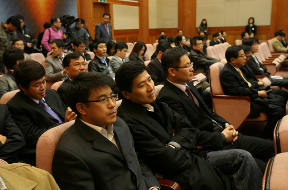 지영준·박지웅·신성수 전 군법무관(왼쪽부터)이 2010년 10월28일 서울 종로구 재동 헌법재판소 안에서 국방부 볼온서적 선정에 대한 헌법소원 결과를 기다리고 있다. 이날 헌재는 합헌 결정을 내렸다. <한겨레> 이종근 기자