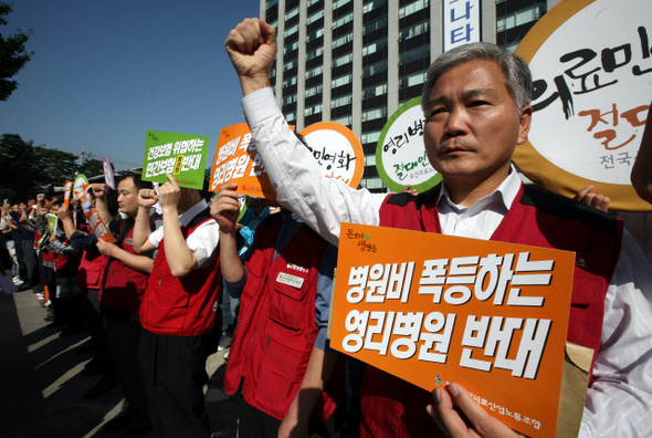 의료민영화 저지와 건강보험 보장성 강화를 위한 범국민운동본부 회원들이 6일 오전 서울 종로구 계동(율곡로) 보건복지부 앞에서 출범식을 갖고 의료민영화 저지 선언을 하고 있다. 한겨레 박종식 기자