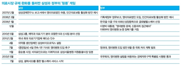지분뿐 아니다. 삼성의 비전은 종종 정부 정책과 그림자 이미지처럼 겹쳤다. 2007년 삼성경제연구소가 내놓은 ‘의료서비스산업 고도화의 과제’ 보고서를 보면, 첫 번째 과제로 “투자 유치 및 경쟁적 환경 조성에 유리하므로 영리의료법인을 허용”하고, 또 하나의 과제로 “민간의료보험의 활성화”를 제시했다. 이듬해 기획재정부의 대통령 업무보고 자료에서도 흡사한 대목이 등장했다. 업무보고의 ‘의료서비스 규제 완화’를 위한 세부 실천 방안 두 가지를 보면, 첫째가 “의료서비스의 질적 향상과 다양화를 위해 영리의료법인 도입을 검토”, 둘째가 “의료 분야 투자 확대와 다양한 의료서비스 확충을 위한 민간의료보험 활성화 추진”이었다.
