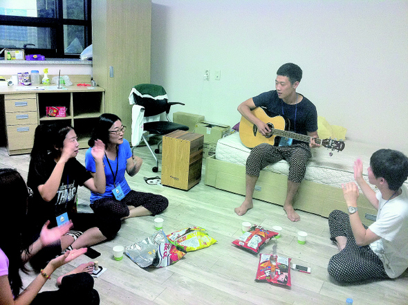 젊은 여행객들이 대학 기숙사를 숙소로 빌릴 수 있도록 도와주는 서비스 ‘돔서핑’ 대학생 서포터스들이 충북 제천시 세명대 기숙사에서 잠시 짬을 내 노래를 부르고 있다.