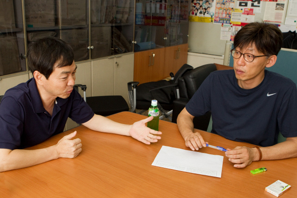 두 방송사 모두 긴 파업을 끝내고 업무에 복귀했지만, 사 쪽과의 갈등 불씨는 여전히 남아 있다. 지난 7월31일 서울 여의도 MBC노동조합 사무실에서 대화를 나누고 있는 언론노조의 김현석 KBS본부장(왼쪽)과 정영하 MBC본부장. 한겨레21 박승화