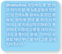 이 지점에서 이선옥이 올린 트윗(@namufree)은 많은 생각을 하게 만든다. 희망버스를 일컬어 혹자는 ‘노동 없는 노동운동’이라는 표현을 썼는데, 이 말이 지칭하는 의미를 이 트윗은 잘 보여준다. 이런 현상은 왜 나타난 것일까? 트위터라는 새로운 매체 환경 ‘덕분’이다. 셀러브리티들과 그 팬덤이 노동운동 바깥에 머물지 않고 그 안으로 개입할 수 있는 통로가 열린 것이다.