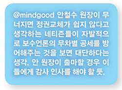 ‘단란함을 모른다’던 그의 발언이 그의 이미지를 형성하는 데 기여한 바가 적지 않다면, 이를 검증할 권한이 언론에 있음을 인정해야 한다. 그래서 안 원장 쪽의 대응은 더 적극적이어야 한다. 기사의 기본을 찾고 대꾸할 가치를 찾기보다는 한국 사회 남성들이 누리는 부조리한 단란함과 안 원장이 어떻게 결별할 것인지를 입체적으로 웅변하는 편이 옳고, 훨씬 낫다. 안 원장이 그런 사람이 아니고, 또 아니라면 말이다. 그래야만 진짜 중요한 논란, 수구언론과 포털의 동맹에 관한 의혹을 확장할 수 있다. 네이버 사장은 이례적으로 직접 나서 ‘박근혜 콘돔’ 논란을 해명했다. 하지만 정작 꽤 많은 네티즌들이 듣고 싶은 해명은 따로 있다. ‘네이버는 접수했다’던 이 정권 인사들의 ‘허세’는 아직 유효한 것인가?