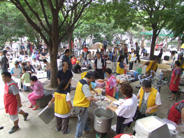 2011년 추석 명절을 맞아 사랑방마을 공제협동조합원들이 손수 음식을 마련해 마을 어르신들에게 대접하고 있다. 조합원들은 매년 어버이날·정원대보름·추석 때 이런 행사를 열고 있다. 사랑방마을 공제협동조합 제공