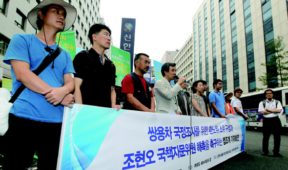 민주사회를 위한 변호사모임과 민주주의법학연구회가 지난 8월10일 서울 여의도 새누리당사 앞에서 쌍용차 국정조사와 조현오 국책자문위원 해촉을 촉구하는 기자회견을 열었다. 한겨레 신소영 기자