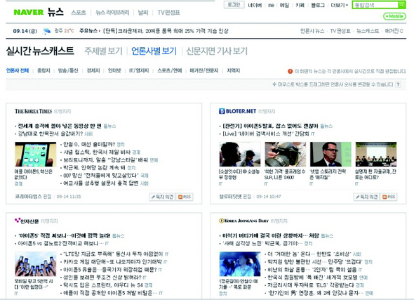 그곳에는 51개의 뉴스 세트가 있다. 한 세트에는 9개 뉴스가 포함된다. 하루에 3번꼴로 정비되므로 1500건 정도의 뉴스가 공급된다. 네이버 뉴스캐스트를 통해서다. 네이버 뉴스캐스트는 네이버에서 운영하는 언론사들의 공간이다. 언론사 총 51곳이 톱뉴스·사진뉴스를 포함해 9개의 뉴스를 제공한다(같은 주제의 뉴스는 한꺼번에 2개를 넘지 못한다). 네이버 메인 뉴스캐스트 공간에서는 주제별로 제공된다. 오른쪽 언론사 메뉴를 클릭하면 언론사 공급 뉴스를 온전히 볼 수 있다.