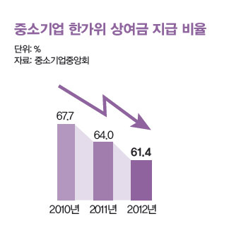 안타깝게도, 올해는 떡값으로 부부 갈등이 시작될 가능성이 더 높다. 748개 중소기업 중 추석 상여를 지급하는 곳은 전체의 67.1%로 지난해보다 소폭 줄어들었다. 상여금은 월 기본급의 64%로 평균 63만원이다. 기혼 직장인들이 부모님 선물과 교통비 등도 충당되지 않는다고 어떤 설문조사에서 우려할 정도다. 대기업은 사정이 낫다. 상위 매출 100대 기업의 67.1%가 평균 월 기본급의 100%를 상여금으로 지급한다.