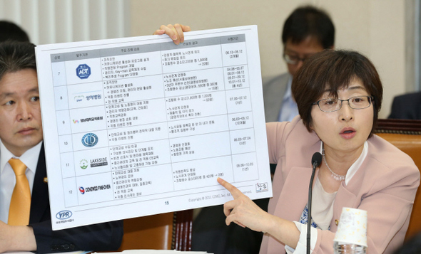 은수미 의원(민주통합당)이 지난 9월24일 국회 환경노동위원회에서 열린 ‘산업현장 폭력용역 관련 청문회’에서 이채필 고용노동부 장관에게 창조컨설팅의 노조 파괴 공작에 대해 알고 있었는지 묻고 있다. 한겨레 이정우