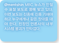 파업에 참여한 기자가 쓴 기사라고? 양심을 지키려는 기자들이 MBC에 여전히 더 많다고? 정말로 그러한가, 지금 정치부에도? 조직적 왜곡의 시스템 앞에서, ‘당신들 파업에서 뭘 배웠나?’라고 묻는 것조차 의미 없어 보인다. 대체 이 낡은 데스크, 환멸의 뉴스를 어찌해야 하나? 민주주의 능멸과 민주정치 배반의 방송을? 엄혹한 군사통치 시절에도 뒤집어보는 시청자의 역능과 행간을 읽는 시민의 의식은 살아 있었다는, 그 엄연한 현대사에서 위안과 희망을 찾을 것인가?