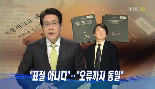 안철수 교수의 논문 표절 의혹을 제기한 MBC 뉴스 장면. 추석 연휴에 보도된 이 뉴스는 편파적 보도라며 비난을 사고 있다.