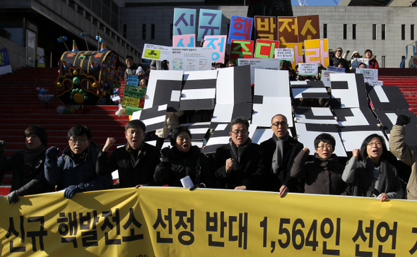 모이자. 그리고 목소리를 내자. 오는 20일에는 청계광장에서 원전 반대 시민 집회가 열린다. 지난해 11월 ‘핵없는 사회를 위한 공동행동’ 소속 회원들이 서울 세종문화회관 계단에서 신규 핵발전소 선정 철회 기자회견을 하고 있다. 사진 한겨레 류우종