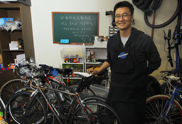 박씨의 하루 일과는 아침 9~10시에 가게 문을 여는 것으로 시작해 밤 9시쯤 문을 닫는 것으로 마친다. 작업대를 청소하고, 판매할 자전거를 내놓고, 이런저런 물건을 주문하고, 소소한 손님들을 응대하다 보면 오전 시간이 훌쩍 간다. 나머지 시간은 주로 자전거를 수리하거나 주문 들어온 자전거를 조립하고 남는 시간에는 공부를 하며 보낸다. 학교를 마치거나 퇴근 뒤 들르는 손님이 많아 저녁 시간은 이들을 맞느라 분주하다. 세상 돌아가는 일에 민감하게 반응하고, 세상을 굴리는 여러 사람을 만나야 했던 지난 일에 비하면 어쩌면 밋밋하고 지나치게 정적인 일상이다. 박씨는 회사를 그만두고 보낸 지난 10개월을 돌이키며 이렇게 말했다. “그동안은 세상이 돌아가는 중심에 너무 가까이 있었어요. 한 걸음 떨어져 있는 것도 좋아요. 뉴스는 신문과 여러 매체로 언제나 보고 있기도 하고. 제가 알고 싶은 정도만 알고, 어느 정도 거리감이 있는 지금도 좋은 것 같아요. 그러니까 생활이…. 마침 가게 자리도 큰 길에 있는 것이 아니라 골목 안으로 들어와 있잖아요. 번잡함에서 벗어난 일상이 좋아요.”