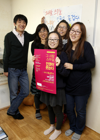수원시 매곡동 주택가 2층에 있는 사무실의 벽면에는 이들이 뭐가 좋아서 월급도 줄이며 인권운동을 했는지 증거가 남아 있다. 먼저 전태일 판화가 있다. 그 옆에는 2011년 인권영화제 포스터가 붙어 있다. 단체 게시판에는 경기도 평택 쌍용차 점거파업 노동자들이 준 ‘인권의 소금들에게’ 감사장이 눈에 띈다. 지역 인권단체들은 1990년대 중·후반 인권영화제를 지역에서 주최하며 성장했다. 다산도 예외는 아니었다. 여기에 매향리, 대추리, 쌍용차, 용산 등의 이름이 더해진다.