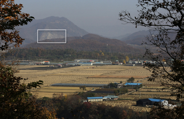 마을을 가로질러 포탄이 날아간다. 아이들 머리 위로 포탄이 날아간다. 포탄 표적지점(사각형 안)에 ‘백발백중’시키겠다는 군인들 말을 어디까지 믿어야 할까. 집에는 금이 가고 사람들은 놀라 허리를 다쳤다. 거저울 훈련장에서 바라본 신답리 마을. 사진 한겨레21 탁기형 기자