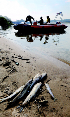 지난 10월21일 오후 충남 부여의 금강 백제보 근처 백제교와 부여대교 밑에서 환경청 관계자들이 폐사한 물고기들을 거둬들이고 있다. 이명박 정부가 강을 살리겠다며 30조원 가까운 돈을 퍼부은 거대한 토목공사가 마무리된 뒤, 오히려 물고기들이 떼죽음을 당하고 있다. 4대강은 ‘킬링필드’가 된 것일까. 사진 김경호기자 jijae@hani.co.kr