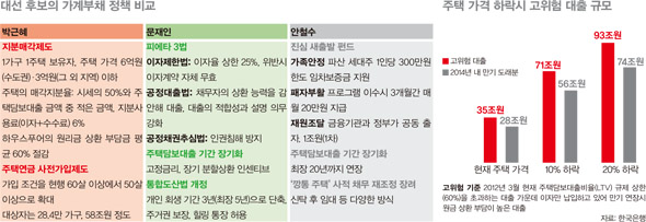 안철수 무소속 후보도 10월25일 ‘가계부채 및 하우스푸어 해결을 위한 6대 과제’를 발표하며 주택담보 대출 기간을 최장 20년까지 연장하겠다고 밝혔다. 현행 금융권의 관행을 바꿔야 한다는 문 후보의 문제의식과 맞닿아 있다. 통합도산법을 개정해 파산자와 개인 회생자의 주거권과 6개월간 생활비를 보장한다는 공약도 마찬가지다.