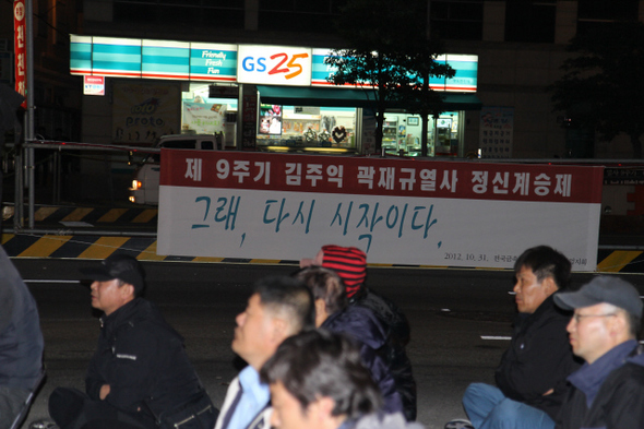 2012년 10월의 마지막 밤, 부산 영도 한진중공업 앞 거리에서 열린 김주익·곽재규 열사 9주기 추모제. 공장 안에서 열리지 못한 이날 행사는 노동자의 쓸쓸한 현실을 보여주는 듯했다. 민주노총 금속노조 한진중공업지회 제공