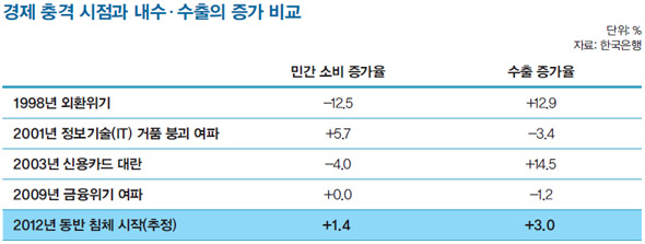 특히 박근혜 경제의 앞날에 안 좋은 소식은 경제 회복을 기댈 곳이 마땅치 않다는 점이다. 사실 역대 정권들이 취임 초에 경제침체와 싸워야 하는 불운을 겪었다지만 그래도 내수와 수출 가운데 한 가지는 양호한 상황에서 경제정책을 펼 수 있었다. 김대중 정부는 글로벌 수출 환경 호조 덕분에 환란을 예상보다 빠르게 벗어날 수 있었고, 노무현 정부도 신용카드 대란으로 무너진 내수를 두 자릿수 수출 증가로 만회할 수 있었다.