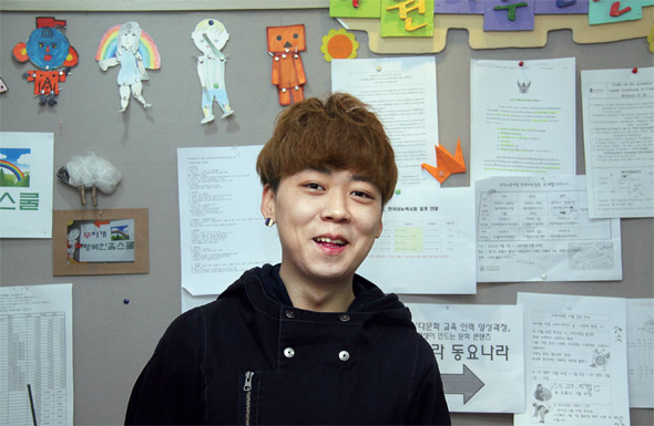 스타일리스트가 꿈인 덕곤이는 꿈에 걸맞게 스타일이 범상치 않다. 한국과 중국의 경계에 서 있는 듯한 덕곤이가 유일하게 정붙이는 곳이 경기도 수원이주민센터다. 센터 게시판 앞의 덕곤이. 무지개 제공