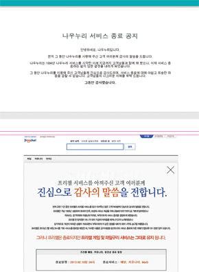 지난 1월31일 문을 닫은 나우누리 누리집의 첫 화면(위)과 2월18일 서비스 종료를 알리는 프리챌 누리집의 첫 화면.