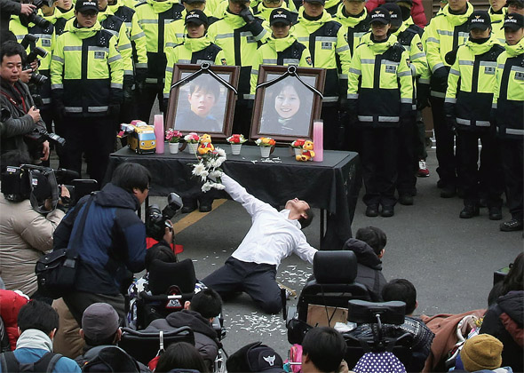 지난해 10월 화재사고로 의식을 잃은 뒤 45일 만에 숨을 거둔 11살 뇌성마비 장애아동 박지훈군의 49재 추모굿이 지난 1월31일 서울 종로구 삼청동 대통령직인수위원회 앞에서 열렸다. 한겨레 이정아 기자