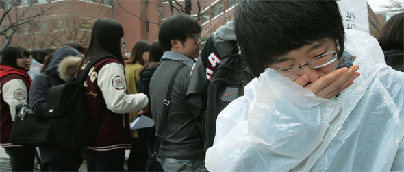 덕성여대 총학생회 학생들이 지난 4월2일 학생회관 앞에서 기자회견을 열어 ‘진보 2013’ 강연 개최를 불허한 학교를 비판하고 있다. 석자은 부총학생회장은 발언 도중 울음을 터뜨렸다. 한겨레 이정아 기자