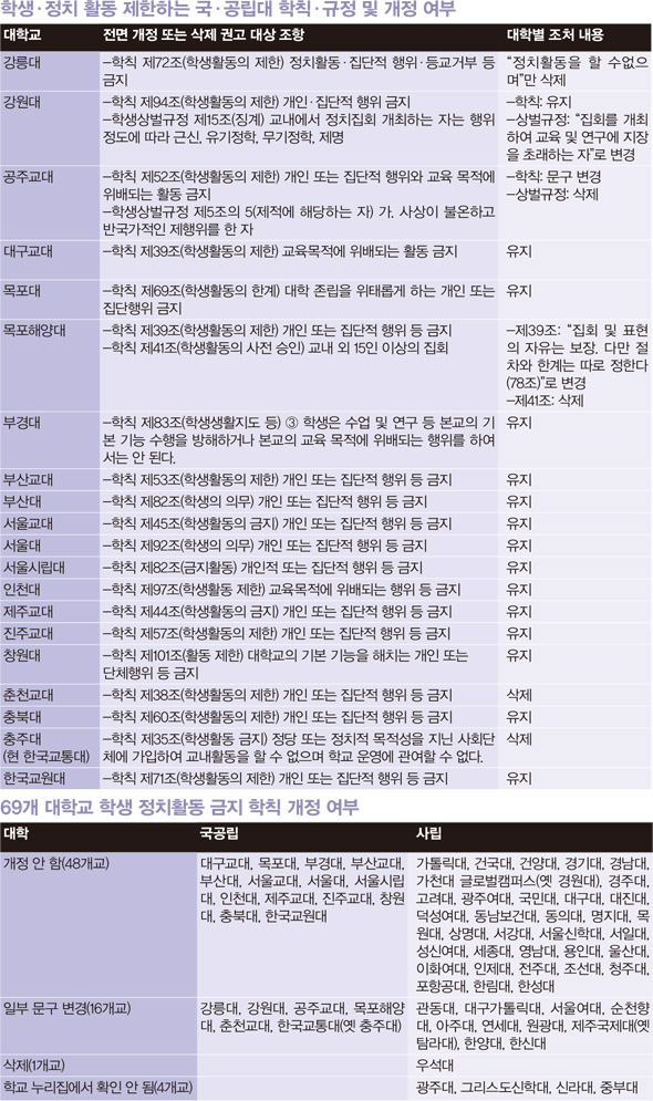 <한겨레21>은 6년 전 인권위가 지적했던 69개 대학의 ‘문제 학칙’을 다시 전수조사했다. 각 대학의 학칙·시행세칙·학생활동규정·상벌규정 등을 검토한 결과, 대학생들의 정치활동을 억압하는 독소조항은 여전히 맹위를 떨치고 있었다. 인권위 권고를 비교적 충실히 따랐다고 볼 수 있는 학교는 국공립과 사립을 합쳐 우석대(‘학생활동의 제한’ 제60조 삭제) 1개교(1.5%)뿐이었다. 우석대는 집회 허가제도 신고제로 바꿨다.