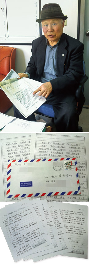 강도치사죄로 징역 15년을 선고받고 군산교도소에서 복역 중인 고수영씨의 아버지 고낙정씨가 대전 서구 도안동에서 아들의 수사기록을 보여주며 억울함을 호소하고 있다(위). 아래는 고수영씨가 재심 청구를 요청하며 변호인에게 보낸 편지들. 한겨레 정은주 기자
