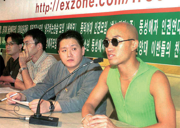 2001년 7월 동성애자 차별반대 공동행동 발족식에서 탤런트 홍석천씨가 인터넷 등급제 폐지 등의 내용을 담은 정보통신윤리위원회 위원장에게 보내는 공개질의서를 발표하고 있다. 한겨레 자료