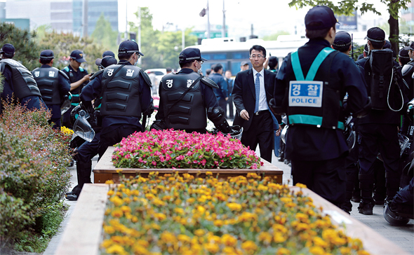 경찰들이 지난 5월15일 서울 중구 대한문 앞 꽃밭을 지키고 있다. 이 꽃밭은 서울 중구청이 4월4일 쌍용자동차 해고노동자 농성 천막을 철거한 자리에 조성했다. 꽃들 너머로 꽃밭에 자리를 내준 채 밀려난 농성장이 보인다. 한겨레 정용일 기자
