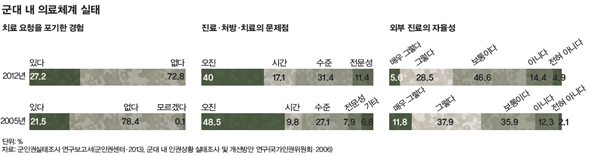 일반적으로 사병들은 병의 위중함에 따라 ‘각 부대의 의무실 → 군 통합병원 → 민간 대학병원’ 순서로 의료기관을 옮기게 되는데, 이 체계가 제대로 이뤄지지 못하고 있다는 것이다. 군 시설을 벗어나 민간 병원 등 외부 진료를 얼마나 자유롭게 받고 있는지를 묻는 질문에서도 응답자 10명 가운데 2명이 ‘외부 진료의 자율성을 보장받지 못한다고 느낀다’고 답했다. 인권위 조사 때(각각 49.7%, 14.4%)보다 나빠진 수치다. 이에 대해 임태훈 군인권센터 소장은 “모든 군인은 언제 어디서나 민간 병원에서 진료를 받을 권리를 제한받지 않도록 해야 한다”며 “군은 전방의 야전병원을 강화해 병사들과 주민의 의료를 책임지고, 민간 병원은 군인을 우선적으로 진료하는 제도를 마련하는 것이 바람직하다”고 지적했다. 군대 내 진료권 개선 문제는 여전히 ‘동작 그만’ 상태다.