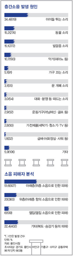 당시 아파트 관련 기사를 보면, 일본에서 벌어진 이른바 ‘피아노 살인사건’을 소개하 는 글이 심심찮게 등장한다. 1974년 일본 가 나가와현에서 아파트에 살던 한 중년 남성이 아랫집의 피아노 연주 소리가 시끄럽다며 내 려가 홧김에 쇠망치로 일가족 3명을 살인한 사건이다. 먼 나라 소식처럼 전해지던 ‘피아 노 살인사건’은 40년 만에 우리나라에서도 현실이 됐다. 지난 2월 서울 면목동에서 층 간소음 문제로 아래층 주민의 내연남이 위 층에 사는 노부부의 아들 2명을 살해한 사 건을 보면 그렇다. 층간소음이 원인이 된 범죄는 들불처럼 번졌다. 지난 3월 부산에서는 아래층 주민이 위층에 항의하러 가서 가족을 칼로 찌른 사건이 일어났고, 지난 5월13일에는 인천 부평구에서 층간소음 문제로 다투던 집주인이 세입자의 집에 불을 질러 2명을 숨지게 한 사건이 있었다. 통계청의 인구주택총조사 결과를 보면, 2010년 기준 아파트에 사는 가구 수만 816만9천 가구다. 대한민국 전체 가구의 47.1%로, 4인 가구 기준으로는 전체의 65.1%를 차지한다. 소규모 공동주택까지 합치면 대한민국에 사는 10명 가운데 7명은 누군가와 천장(바닥)을 맞대고 있어 층간소음의 공포에서 자유롭지 못한 셈이다.